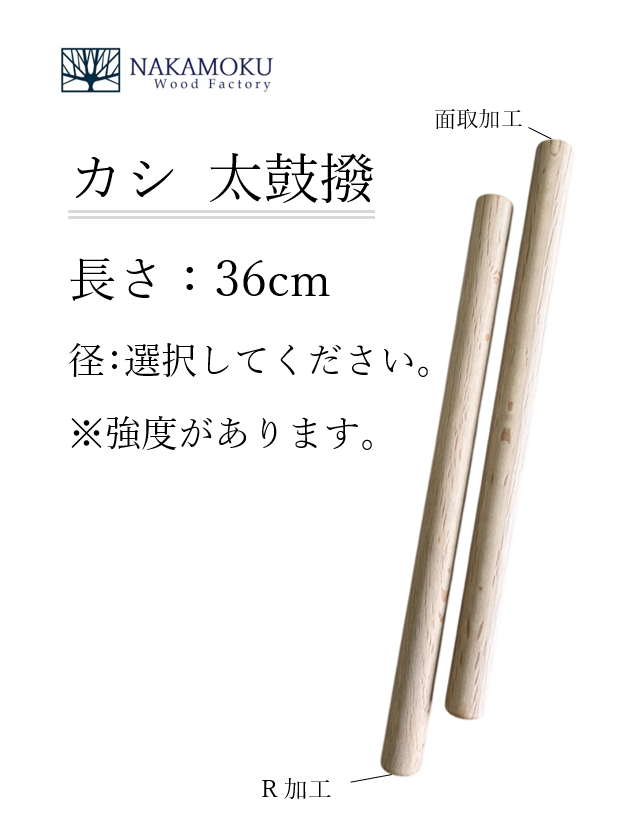 カシの丸太から太鼓バチを1本1本作っているため、この価格でお求め頂けます。