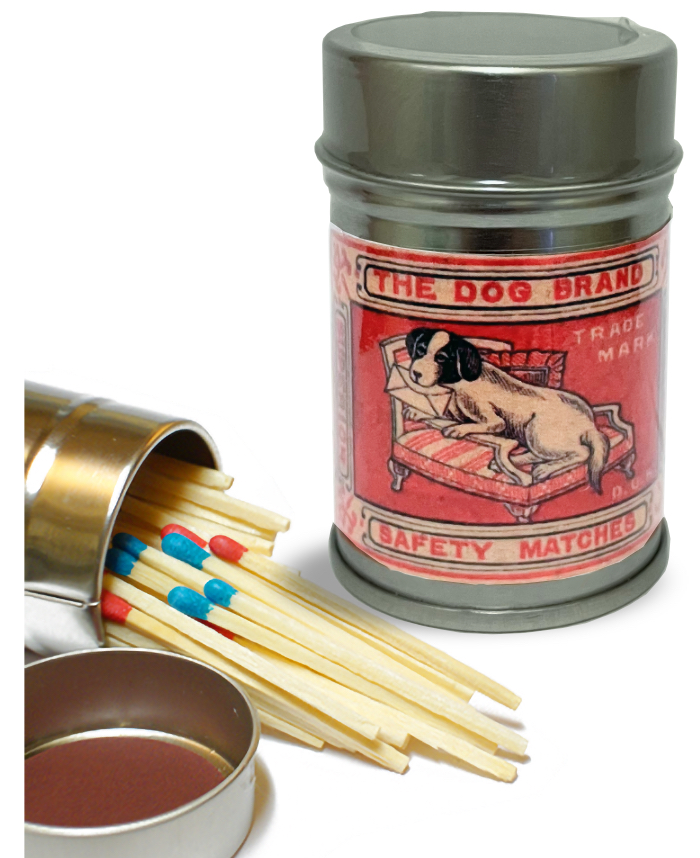 レトロラベル缶マッチ・犬シリーズは、防湿効果と安全性を保持できるよう缶ふたの内側にマッチを擦って火をつける側薬を張り、マッチの軸向きは火のつく頭が下になります。