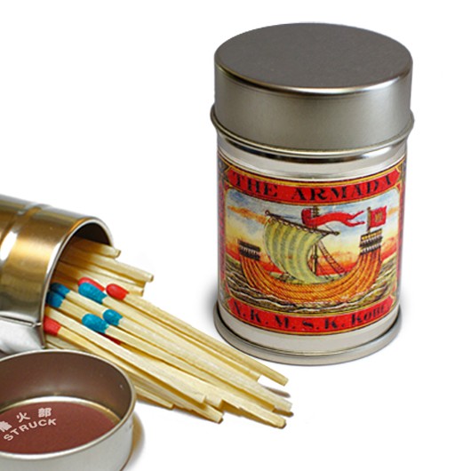 レトロラベル缶マッチ・船シリーズは、防湿効果と安全性を保持できるよう缶ふたの内側にマッチを擦って火をつける側薬を張り、マッチの軸向きは火のつく頭が下になります。