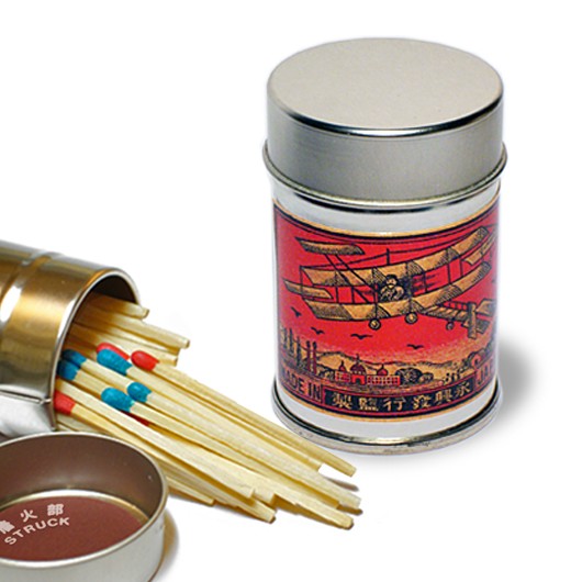 レトロラベル缶マッチ・飛行機シリーズは、防湿効果と安全性を保持できるよう缶ふたの内側にマッチを擦って火をつける側薬を張り、マッチの軸向きは火のつく頭が下になります。