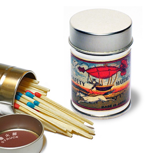 レトロラベル缶マッチ・飛行機シリーズは、防湿効果と安全性を保持できるよう缶ふたの内側にマッチを擦って火をつける側薬を張り、マッチの軸向きは火のつく頭が下になります。