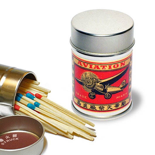 レトロラベル缶マッチ・飛行機シリーズは、防湿効果と安全性を保持できるよう缶ふたの内側にマッチを擦って火をつける側薬を張り、マッチの軸向きは火のつく頭が下になります。