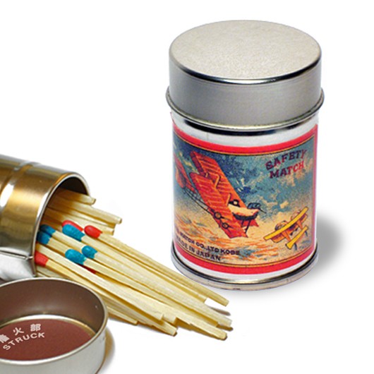 レトロラベル缶マッチ・飛行機シリーズは、防湿効果と安全性を保持できるよう缶ふたの内側にマッチを擦って火をつける側薬を張り、マッチの軸向きは火のつく頭が下になります。