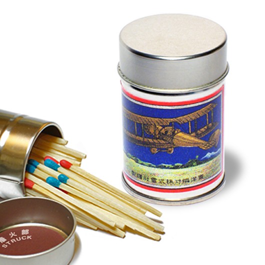 レトロラベル缶マッチ・飛行機シリーズは、防湿効果と安全性を保持できるよう缶ふたの内側にマッチを擦って火をつける側薬を張り、マッチの軸向きは火のつく頭が下になります。