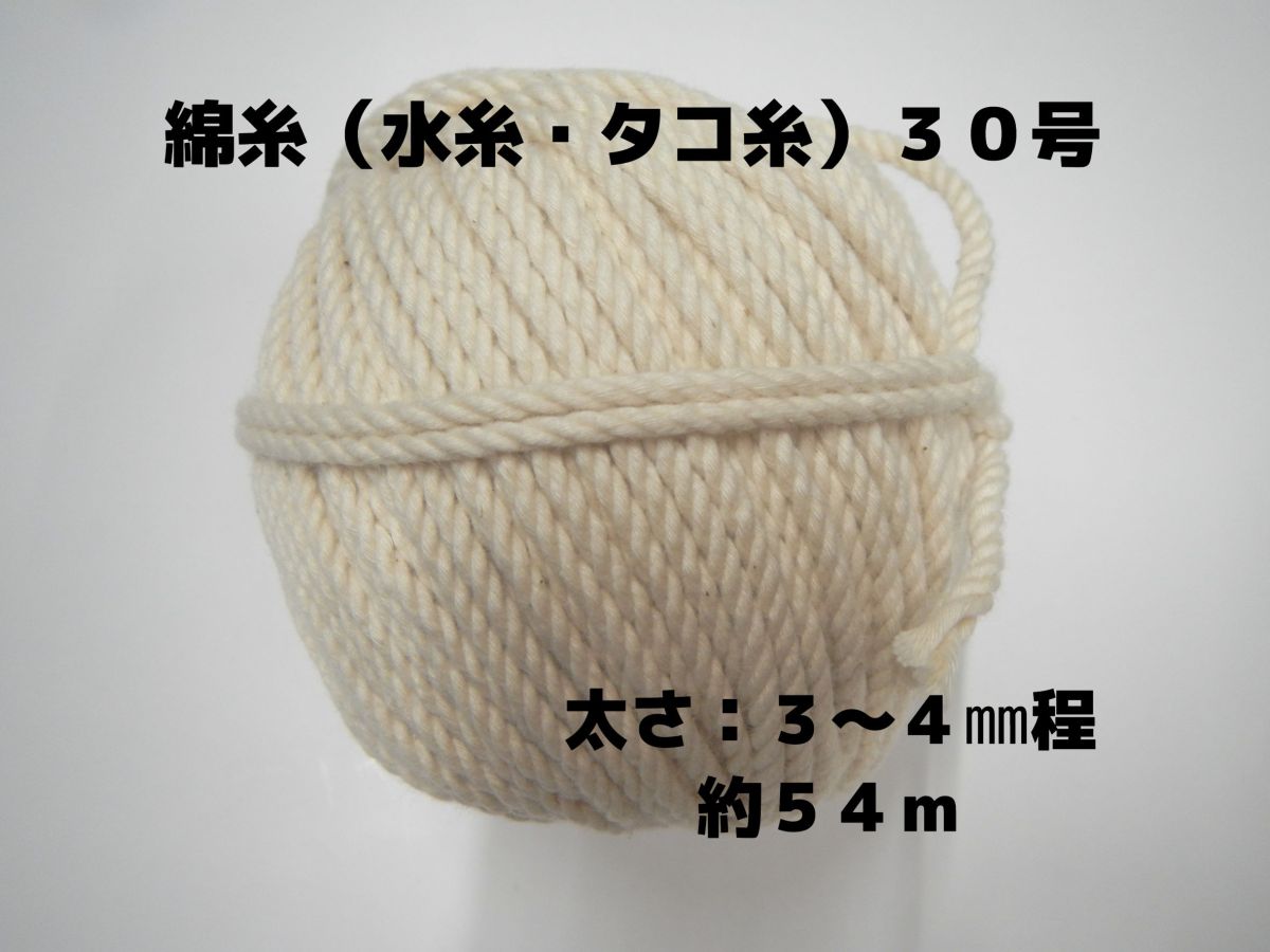 綿糸(水糸・タコ糸)の30号です。太さ:約3〜4mm 約54m巻きです。太さ、長さは、おおよその数値です。