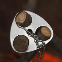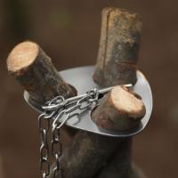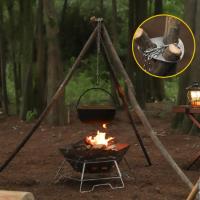 自作トライポッド 枝木を束ねてトライポッドにするステンレス製アタッチメント。木の先端部を大雑把に三角形にし、ホールに差し込むだけで安定したトライポッドになります。 金具中心の穴に付属のチェーンを通し、チェーンの先端にあるフックに鍋を吊し、火を起こせば調理が行えます。 ピンの差し込む位置によって、チェーンの長さを調整可能です。火と鍋の距離を変えて火力の調整を実現できます。 | |