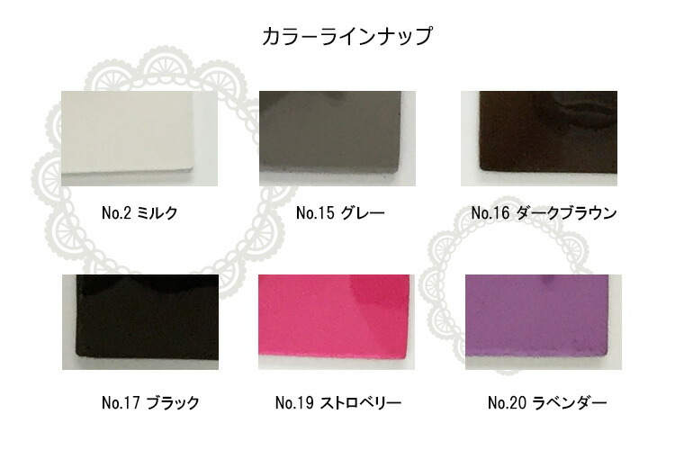 (1)クリア(透明)、(2)ミルク、(9)ピンク、(12)グリーン、(15)グレー、(16)ダークブラウン、(19)ストロベリー、(20)ラベンダー、(17)ブラック