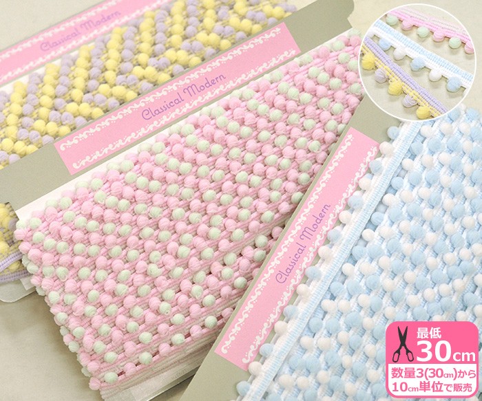 縁取ったり挟んだり縫ったりして使えるポンポンテープが登場しました。