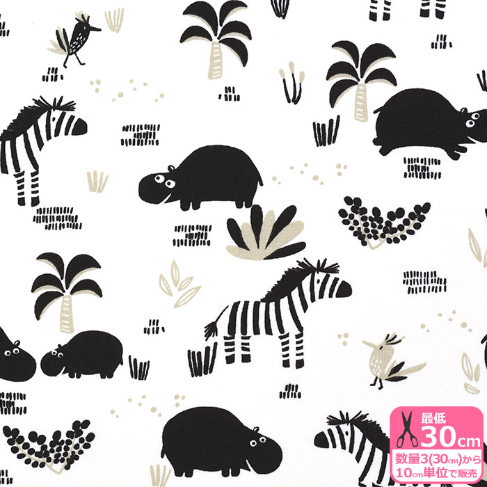 モノクロのどうぶつたちが並んだジャージ生地です。