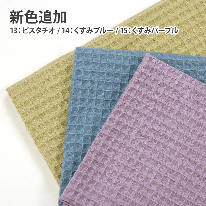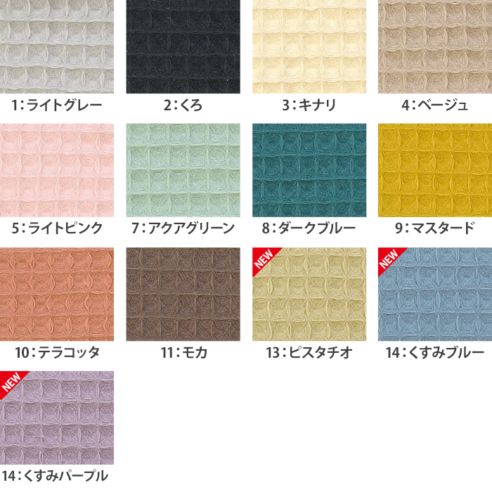1:ライトグレー (161番) / 2:くろ (402番(黒)) / 3:キナリ (270番) / 4:ベージュ (368番) / 5:ライトピンク (3番) / 7:アクアグリーン (343番) / 8:ダークブルー (349番) / 9:マスタード (375番) / 10:テラコッタ (238番) / 11:モカ (381番) / 13:ピスタチオ(365番) / 14:くすみブルー(267番) / 15:パープル(386番)