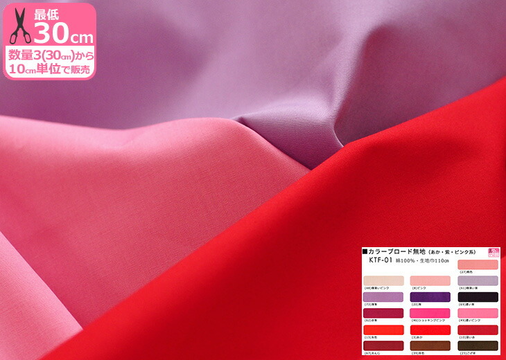 カラーブロード無地 赤 紫 ピンク系 ブロード 無地 ピンク 茶色 朱色 綿100% 日本製 生地 布 KTF-01 入園入学 スモック バッグの内布 数量3(30cm)から10cm単位
