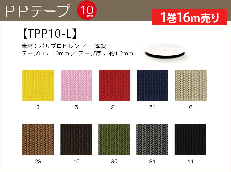 ナイロン素材の生地や厚手の帆布などとの相性がいいPP(ポリプロピレン)テープです。
