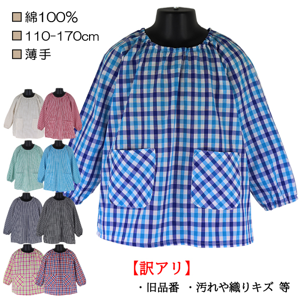 【訳アリ:旧品番・汚れや織りキズ 等】 綿100% 110-170cm ギンガムチェックスモック 小学校 中学校 子供 キッズ 長袖 入園 入学 通園 通学 【送料無料】