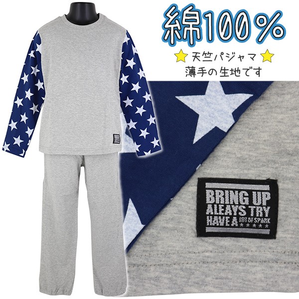 【訳アリ:汚れ・パッケージ不良等】綿100% chuchum 袖星総柄 100-140cm 子供 男児 天竺 長袖 パジャマ 上下セット【送料無料】