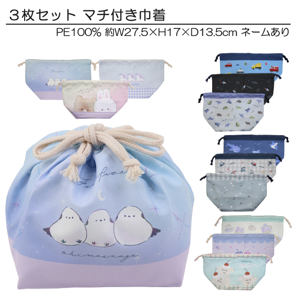 ◆ニシオ◆ 3枚セット マチ付き巾着 ランチ巾着 お弁当袋 約27.5×17×13.5cm 入園 入学 通園 通学【送料無料(税込1000円のお買上げが条件)】
