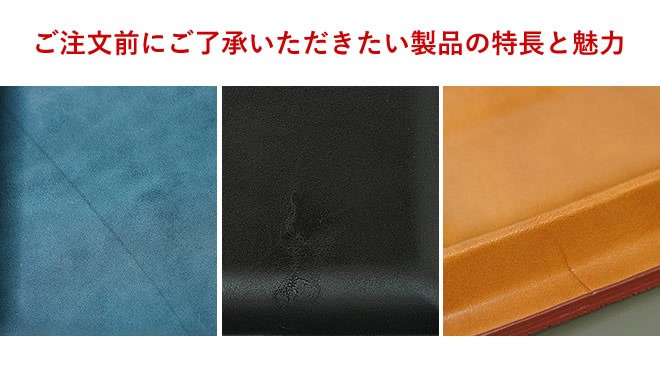 ご注文の際にひとつひとつの革の表情をお選びいただくのが困難であることをご理解いただいた上でご注文下さいませ。「商品に破損のある場合(革本来の傷は除く)、商品の送り間違い」以外の場合では「当店の不手際による返品、交換」としてはお受けすることができませんことをご了承いただきますようお願い申し上げます。