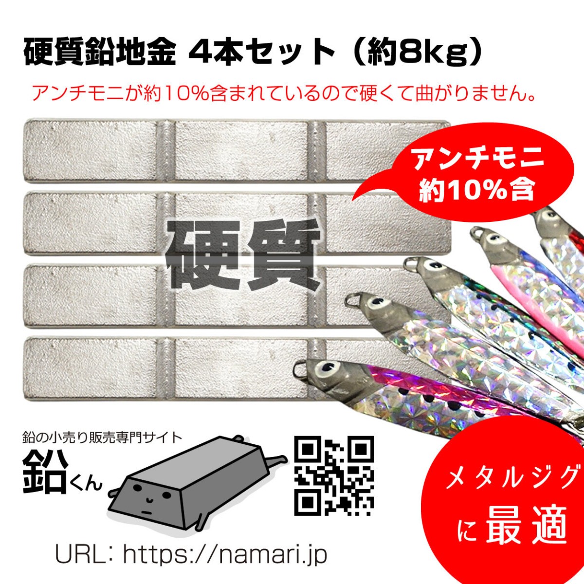 硬質 鉛 地金 4本(約8kg) 鉛くん メタルジグ 釣りの錘(おもり、オモリ)やスピーカーの制振にも最適。インゴット 鉛君 送料無料