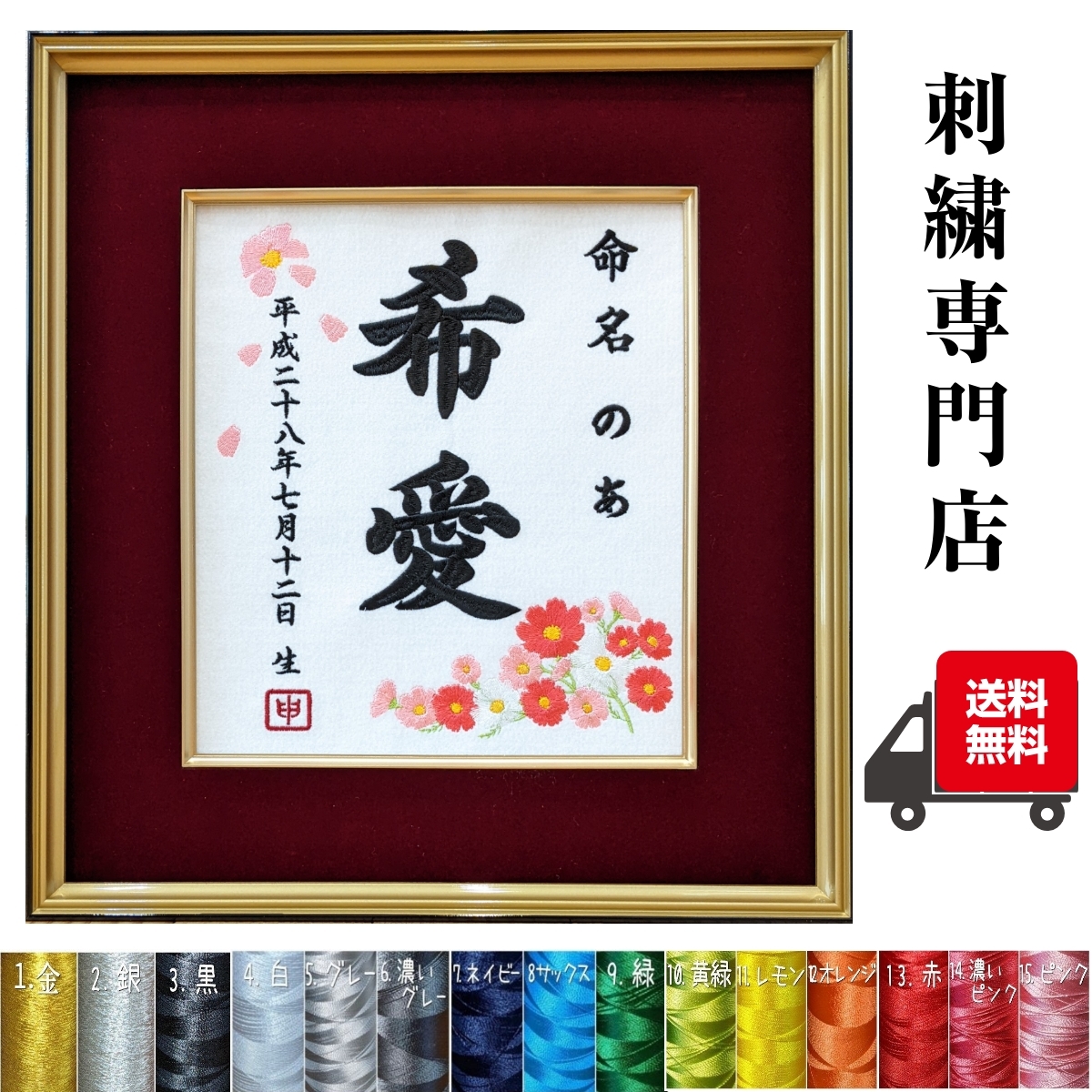 【秋桜刺繍】 秋桜 コスモス 花 刺繍 刺繍命名額 命名書 刺繍 出産祝い お祝い こどもの日 命名額 刺繍 額 最高級版 かっこいい 干支 命名紙 お七夜 100日