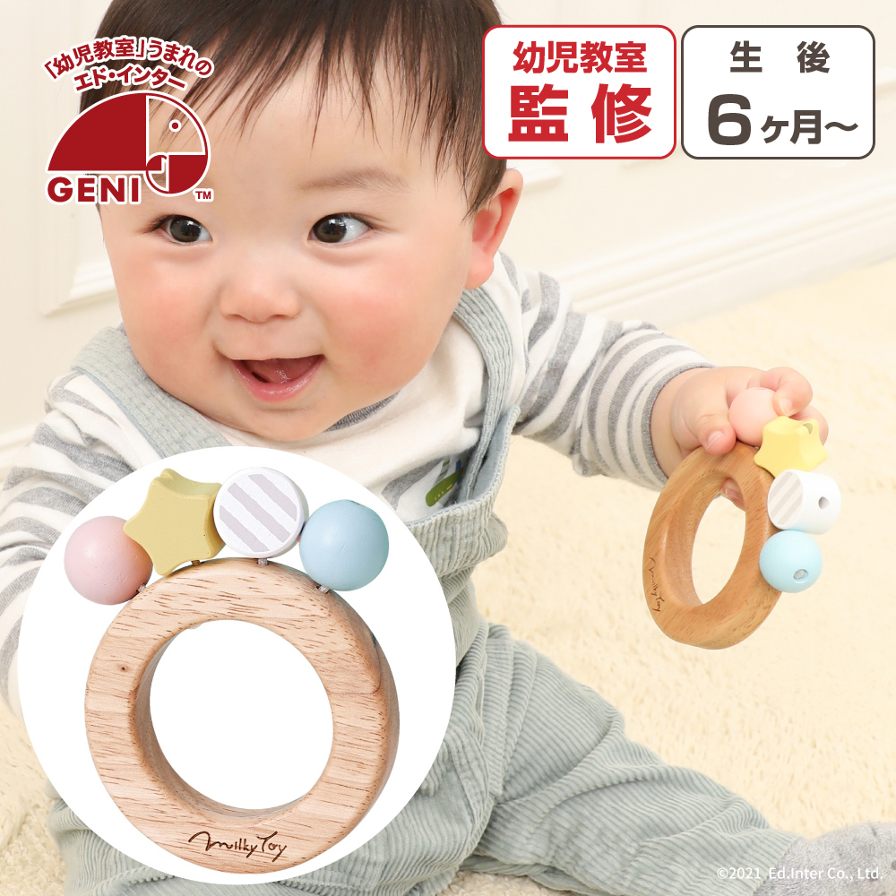 商品名:おもちゃ 0歳 1歳 出産祝い ラトル 木製 男の子 女の子 ガラガラ プレゼント 赤ちゃん ベビー ボンボンラトル エドインター Milky toy 知育玩具 星 ギフト