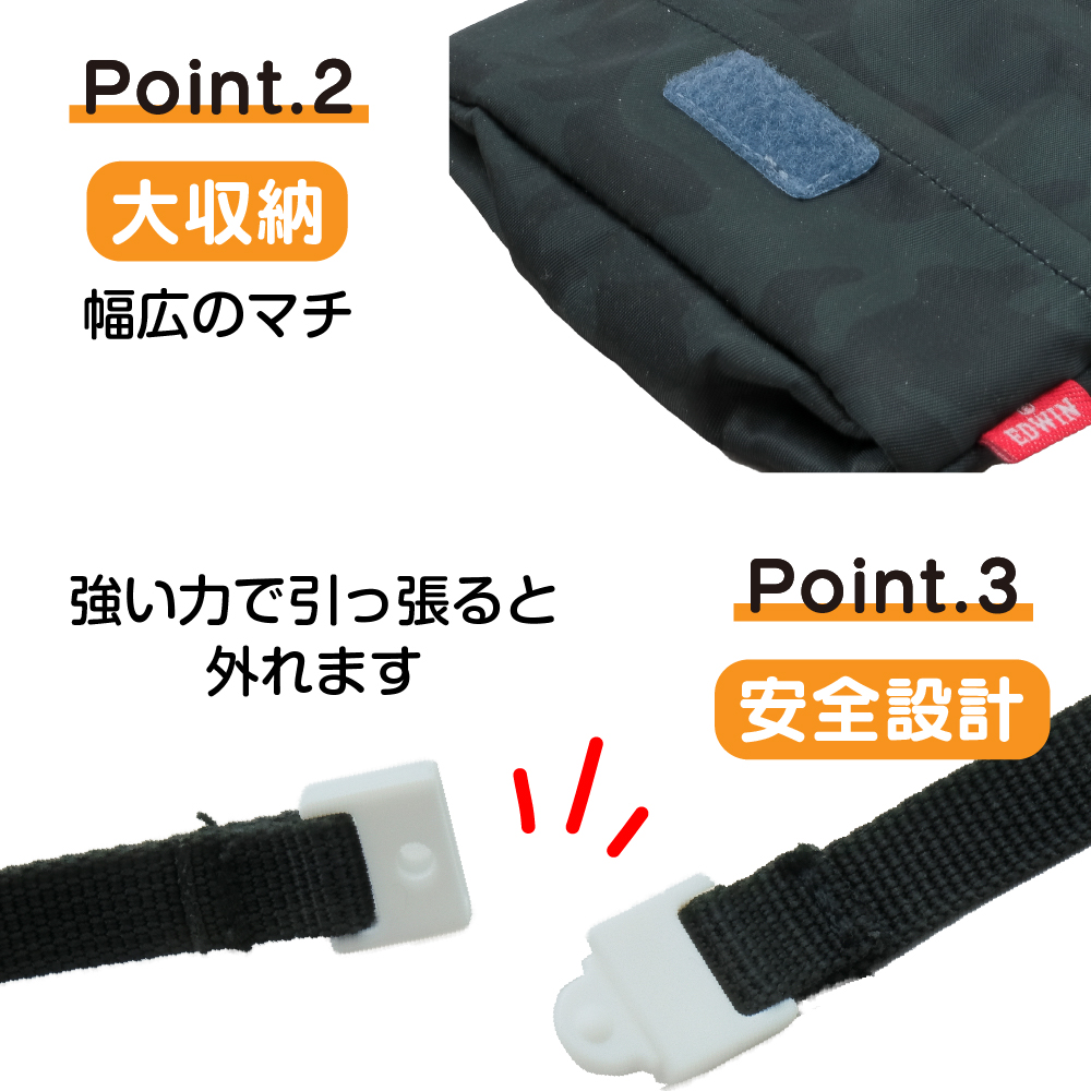 ショルダーベルトには引っかかった時に外れる安全パーツ付き