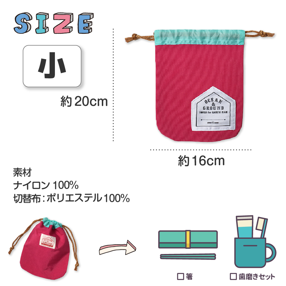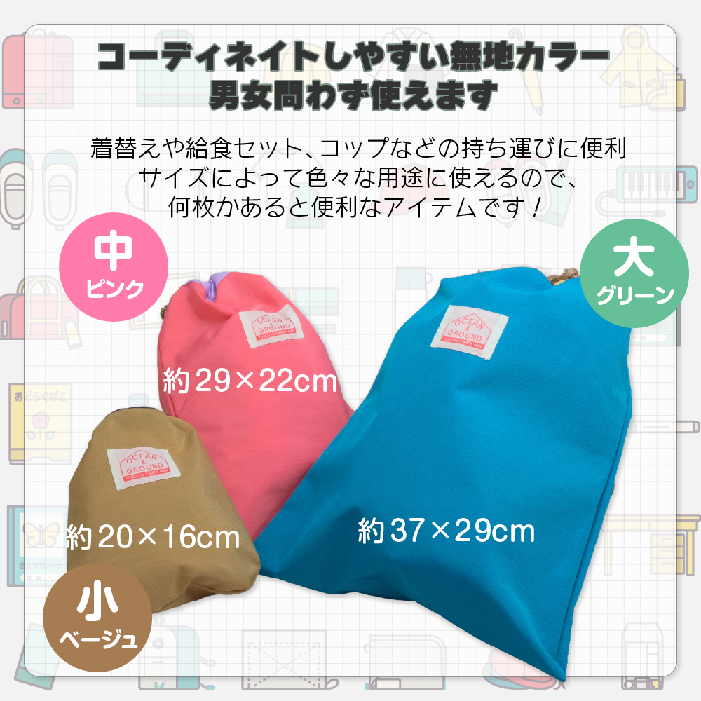 巾着袋 バッグ ポーチ 小サイズ キッズ 子供 無地 ミニ 給食袋 お弁当 ランチ 幼稚園 保育園 小学生 入園 歯ブラシ コップ 入学祝い セット オーシャン&グラウンド シンプル 可愛い かっこいい 新入園 新入学 こども
