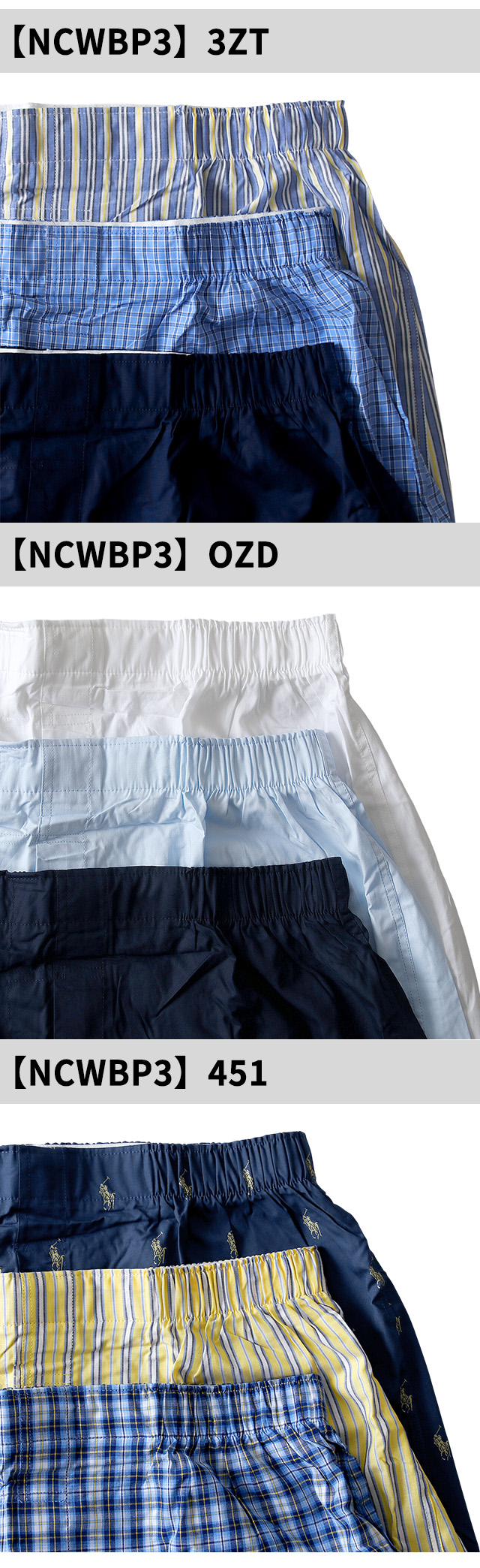 ポロ ラルフ ローレン トランクス メンズ ブランド P3 Classic Fit Woven Boxer 下着 アンダーウェア 3枚セット Polo Ralph Lauren P3 Classic Fit Woven Boxer ネイビー ストライプ チェック ホワイト ライトブルー イエロー ブラック 選べるモデル ◆Ralph Lauren Corporationはアパレル、アクセサリー、ホームグッズ、フレグランス、ホスピタリティのデザイン、マーケティング、流通におけるグローバルリーダーです。 50年以上にわたり、製品、ブランド、海外市場での拡大を通じて、Ralph Laurenの評判と独自のイメージを一貫して培ってきました。POLO RALPH LAUREN(ポロラルフローレン)は、ラルフローレンよりも若干お安い価格帯のラインになります。 ポロラルフローレンは、ラルフローレンシリーズの原点で、ブランドの中心となるメインのラインになります。 シンプルな柄物のトランクス3枚セット。チェック、ストライプなど様々。前開き仕様。ゆったり穿けてちょどいい締め付け感。ポロの定番ポニーロゴがポイントになっています。 NCWBP3-3ZT/NCWBP3-OZD/NCWBP3-451/NCWBP3-QLD/NCWBP3-46G