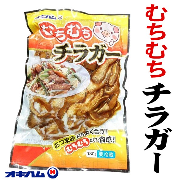 チラガー(豚の顔の皮)には、良質な蛋白質(コラーゲン)が含まれています。醤油をベースに味付けしたチラガーを食べやすくカットしてあります。コリコリとした歯ごたえとむちむちとした食感が楽しめますから、そのままおつまみ、サラダの材料として最適です。