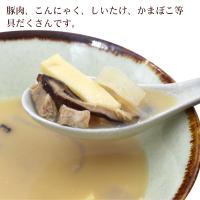 ■原材料:豚肉(輸入)、米みそ、こんにゃく、椎茸、かまぼこ、鰹節、油揚げ、ポークエキス、みりん、昆布エキス、かつお風味だし/pH調整剤、調味料(アミノ酸等)、グリシン、水酸化カルシウム、リゾチーム、(一部に卵・豚肉・大豆を含む