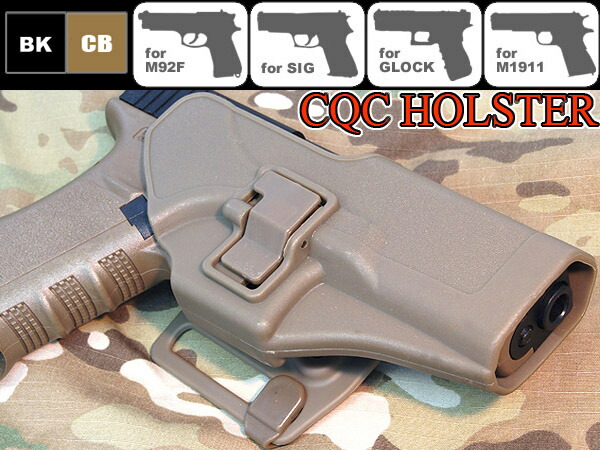 ![]() カチッと収納、ワンボタンでサッと抜ける! 様々な装備品を幅広く製造するPMC御用達メーカー「ブラックホーク(BHI)社」タイプの右利き用 CQCホルスターです。 樹脂製で軽量!各エアガン専用設計で無駄のないコンパクトな形状が特徴です! ■オススメポイント■ 1.ワンタッチで抜ける! 2.樹脂製で軽量&コンパクト 3.様々な装備品に装着可能 【1.ワンタッチで抜ける!】 収納したエアガンはトリガーガード部分でカッチリ固定され、ボタンを押しながら引き抜くだけで簡単にドロー可能! 扱いに慣れることで、メインアームをリリースすると同時にハンドガンを抜くこともできます! 是非練習して最強のガンマンを目指してみてください! 各ホルスターはマガジンキャッチに触れないよう工夫されており、ナイロンホルスターでまれに起こる「ゲーム中に勝手にマガジンキャッチが押されて紛失・・・」という事故を防いでくれます。 【2.樹脂製で軽量&コンパクト】 ホルスターは軽量な樹脂製で、長時間の携行にも負担になりにくくなっております。 また、各種エアガン専用設計のため無駄なスペースがなく、マルチに対応するホルスターと比べるとコンパクト! 他の装備と干渉しにくいため邪魔になりにくく、ハンドガンをスマートに装備することができます。 【3.様々な装備品に装着可能】 付属のアダプターは2種類あり「ベルト用」と「ヒップ用」の2種類が付属します。 ホルスターはアダプターに対して角度を付けることができ、装着する位置や好みに応じて調節が可能です。 また「BHIタイプ モール プラットフォーム」を使用することで、プレキャリなどのMOLLEシステムにガッチリと固定できます。 さらに「BHIタイプ レッグパネル」へ付け替えればレッグホルスターとしても使用可能! ※上記商品はセット商品です。ホルスターが付属します。 このホルスター1つで多彩な使い方ができ、あらゆるスタイルをお試しいただけます。 | ||||||||