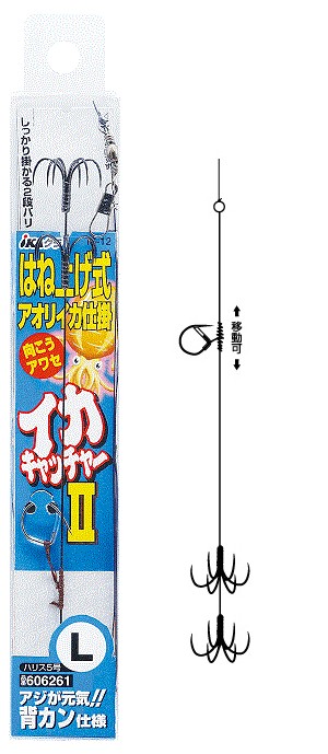 エサの掛鈎に「イカ一番 ワンタッチ背缶」を使用したエサへの負担が少なく、エサがはずれないイカキャッチャー。エサが常に元気なため、イカののりも違います。