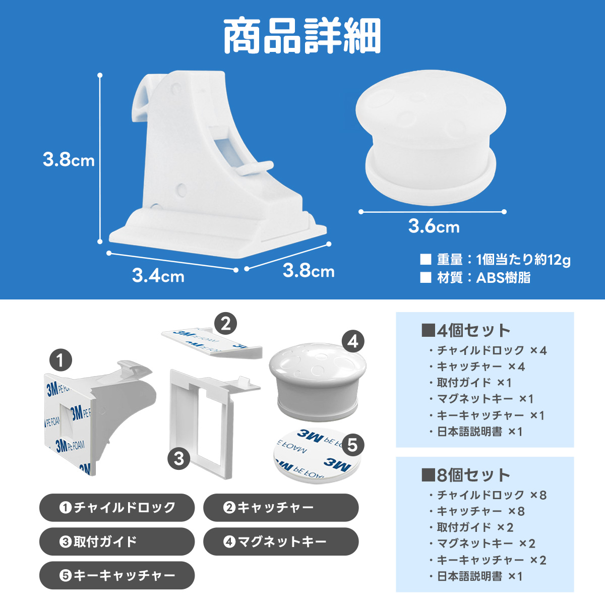 ・セット内容:チャイルドロック4個、キャッチャー4個、取付ガイド1個、マグネットキー1個、キーキャッチャー1個