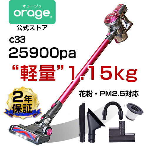 | Orage C33 コードレスサイクロンクリーナー 最大約30分の長時間使用可能! 25900Paの強力吸引で細かい粉じんもどんどん吸い込みます。 重さもわずか1.15kg!(本体重量) スイッチはワンプッシュで連続稼働する構造ですので 指に負担がかかりません。 3つのライトで充電残量を知らせます。 いつでも手軽にお掃除出来て、とっても便利♪ さらに最大75dBの静音仕様。 ペットや赤ちゃんのいるご家庭にもオススメです。 LEDライト装備のフロアヘッド! ソファの下や、家具のすき間など、暗い場所でも見やすくお掃除ができます。 車輪の素材を改善し、走行時の雑音を大幅軽減しました。(2019.12月出荷分より) コンビネーションブラシから、よりお掃除しやすくなったソフトブラシに変更!(2020年1月14日出荷分より)
