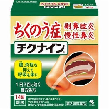 ■商品名チクナイン■商品特長●ちくのう症(副鼻腔炎)、慢性鼻炎を改善する内服薬です●9種類の生薬からなる漢方「辛夷清肺湯」の働きで、鼻の奥の炎症を鎮めながら、膿を抑えて呼吸を楽にします●1日2回で効く、服用しやすいスティックタイプの顆粒剤です■成分、分量(添加物含む)1日量(2包:4.6g)中 辛夷清肺湯エキス粉末 2,500mg<原生薬換算量> シンイ 1.5g、オウゴン 1.5g、セッコウ 3.0g、チモ 1.5g、サンシシ 0.75g、ショウマ 0.75g、ビャクゴウ 1.5g、バクモンドウ 3.0g、ビワヨウ 0.5g添加物:ヒドロキシプロピルセルロース、含水二酸化ケイ素、乳糖水和物■効能、効果体力中等度以上で、濃い鼻汁が出て、ときに熱感を伴うものの次の諸症:鼻づまり、慢性鼻炎、蓄膿症(副鼻腔炎)■用法、用量次の量を朝夕、食前または食間に水または白湯で服用してください。成人(15歳以上) 1包 2回、7歳以上15歳未満 2/3包 4歳以上7歳未満 1/2包 2回、2歳以上4歳未満 1/3包 2回、2歳未満 服用しないこと■用法、用量に関する注意(1)定められた用法・用量を厳守してください。(2)小児に服用させる場合には、保護者の指導監督のもとに服用させること ●食間とは「食事と食事の間」を意味し、食後約2〜3時間のことをいいます■保管及び取扱い上の注意(1)直射日光の当たらない湿気の少ない涼しい所に密栓して保管してください。(2)小児の手の届かない所に保管してください。(3)他の容器に入れ替えないでください。 (誤用の原因になったり品質が変わるおそれがあります。)(4)1包を分割して服用する場合、残った薬剤は袋の口を折り返して保管すること また、保管した残りの薬剤は、その日のうちに服用するか捨てること■お問い合わせ先○メーカー名:小林製薬(株)○住所:567-0057 大阪府茨木市豊川1-30-3○お客様相談窓口 0120(5884)01○受付時間:9:00〜17:00(土,日,祝日を除く)■使用期限1年以上の物■リスク区分【第2類医薬品】■広告文責株式会社なの花西日本 TEL:072-652-0371※リニューアル、発売終了などの場合がございます。予めご了承くださいませ。 使用上の注意■相談すること以下の項目に該当する方は購入前に薬剤師へご相談ください。 医師の治療を受けている人。 妊婦又は妊娠していると思われる人。 体の虚弱な人(体力の衰えている人、体の弱い人) 胃腸虚弱で冷え症の人■ 使用後,次の症状があらわれた場合は副作用の可能性があるので、直ちに服用を中止し、この添付文書を持って医師、薬剤師または登録販売者に相談してください。 消化器:食欲不振、胃部不快感 まれに下記の重篤な症状が起こることがある 間質性肺炎:階段を上ったり、少し無理をしたりすると息切れがする・息苦しくなる、空せき、発熱などがみられこれらが急にあらわれたり、持続したりする 肝機能障害:発熱、かゆみ、発疹、黄だん(皮ふや白目が黄色くなる)、褐色尿、全身のだるさ、食欲不振などがあらわれる 腸間膜静脈硬化症:長期服用により、腹痛、下痢、便秘、腹部膨満などが繰り返しあらわれる■1ヶ月位使用しても症状がよくならない場合は使用を中止し,この文書を持って医師,薬剤師又は登録販売者にご相談ください ◆ここには、知っておいていただきたい主な事柄だけが書いてあります。ご使用の際には「用法・用量」を守り、必ず添付文書にかかれております「使用上の注意」をよくお読みになってください。 掲載されている製品に関する情報は、随時、最新情報に更新するように努力しておりますが、実際の添付文書の記載とは異なっている場合もございますので、必ず製品に入っている添付文書をよくお読みいただいた上で、ご使用になってください。