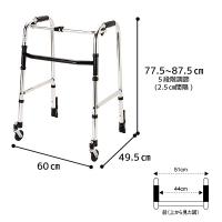 【仕様】 品名:歩行器| シリーズ | Walker〜ウォーカー〜 | | 品番 | HK-120 | | サイズ | ・W60(65)cm ・D49.5(10.5)cm ・H77.5〜87.5(79)cm ・後方60.5cm ()折りたたみ時 | | 高さ | 5段階調整(2.5cm間隔) | | 先ゴムサイズ | 22Φ | | 重量 | 2.8kg | | 主材質 | ・本体:アルミ ・グリップ:PVC ・先ゴム:合成ゴム ・キャスター:合成ゴム ・後輪ストッパー部:ナイロン ・その他樹脂部:PE | | JANコード | 4968501-887307 | | TAISコード | 00690-000035 | | メーカー | マキテック |