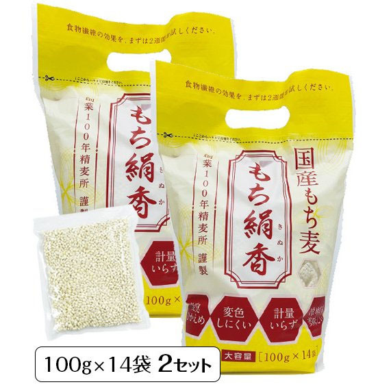 ●品名・名称:精白麦●原材料:大麦(もち麦)(国産)●容量:100g×14袋入●栄養成分:(100gあたり)エネルギー:331kcal、たんぱく質:7.0g、脂質:1.3g、炭水化物:78.0g(-糖質:67.4g、-食物繊維:10.6g)、食塩相当量:0.01g●保存方法:直射日光・湿気を避け、常温で保存してください。●炊き方(使い方):米2合の場合、米を研いで分量の水を入れたあとに、もち絹香1袋(100g)と水200ccを入れて炊いてください。炊きあがり後、10分程蒸らしてください。●注意事項:・大麦の原料原産地の貯蔵、輸送設備等は小麦にも使用しています。★使用上の注意・湿気や虫害などを避けるため、密閉して保管し、賞味期限にかかわらず、お早目にお召し上がりください。・本品の色、形が異なる場合がありますが、収穫時期、品種の差によるものです。・もち麦ごはんを炊飯器で長時間保温しますと、もち麦が変色することがありますが、品質には問題ありません。●発売元、製造元、輸入元又は販売元:勅使川原精麦所栃木県佐野市栃本町1725番地0283-62-1225●広告文責:南風満帆shop●商品区分:国産・[米・穀類]