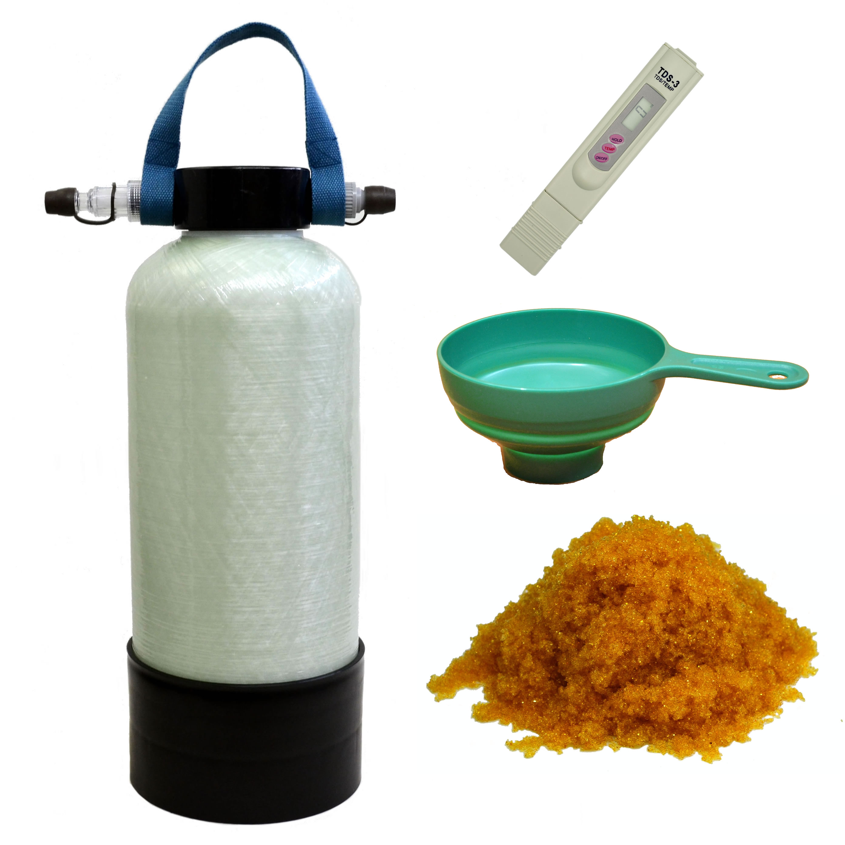国外で製造された部品を輸入、それに国内部品を組み合わせ日本の当工房にて検査及び調整・組み立てを行っています。イオン交換樹脂は受注後、発送前に充填を行い速やかに発送いたします。