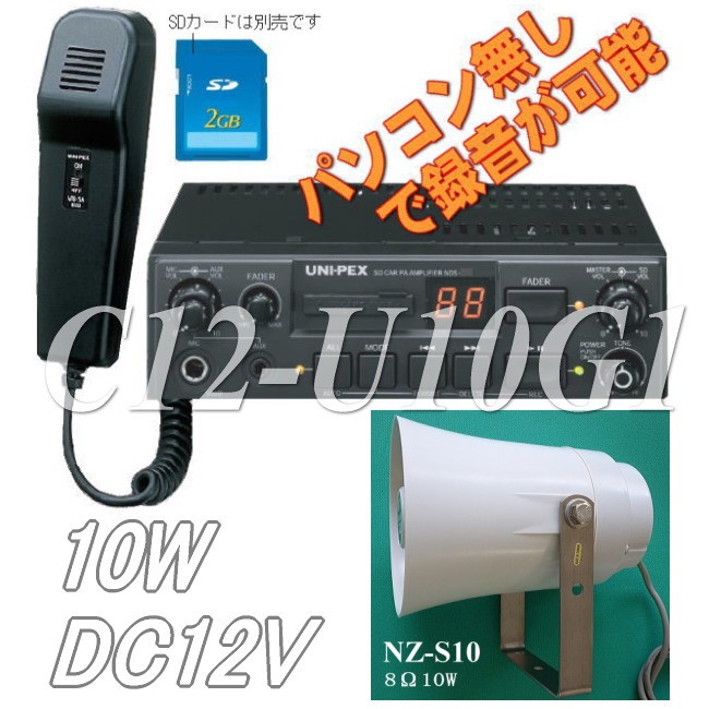 SD / SDHC対応でメッセージ録音可能な車載用拡声器と10W8Ωのトランペットスピーカーとのセット構成品です。優れた機能性と高音質で、移動販売車や広報車、資源回収車、工事車両、建築機械、防犯車、防災車などさまざまなバリエーションにマッチします。