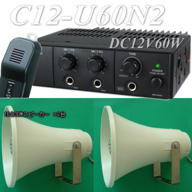 DC12V60Wアンプクリアなマイク放送ができるDC12V60Wアンプのベーシックモデルです。30Wトランペットスピーカー×2台とカールコードマイクのセット構成品になります。電源は車のバッテリーへ接続して使用できます。