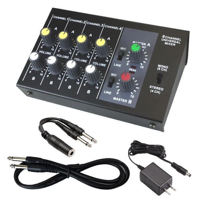 8入力ミキサー、各レベル調整可能2系統(A/B)それぞれ4入力、合計8入力に対応したミキサーです。8入力それぞれのレベル調整ができます。また2系統(A/B)の出力調整も可能です。