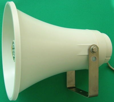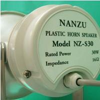 屋外としても使える防水のトランペット型(ラッパ型ホーンスピーカー)NZ−S30です。移動販売などの自動車や船舶でも実績の高いです。指向性があり、遠くまで音が届きます。ローインピーダンス(16Ω)で30Wのスピーカーです。
