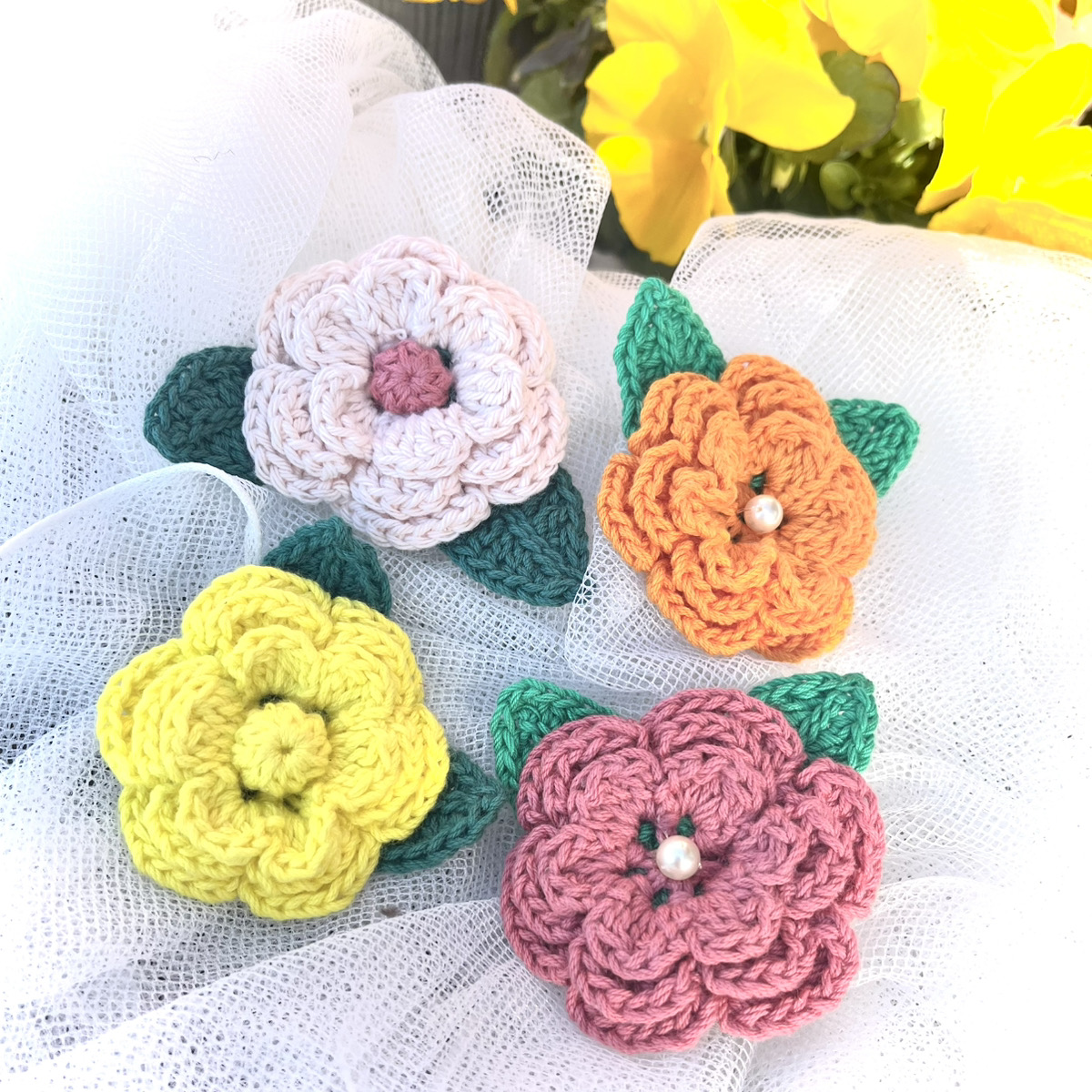 ニットのお花のブローチ お花のモチーフ 葉付 安全ピン ハンドメイド 4カラー