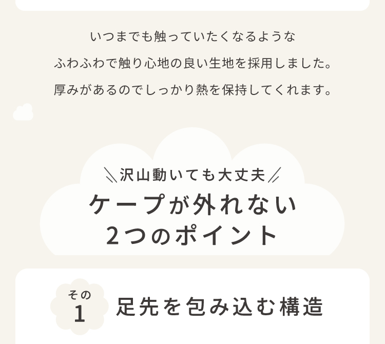 赤ちゃんの足をすっぽり包み込む構造なので、赤ちゃんが足をバタバタさせてもケープから出てしまう心配がありません。