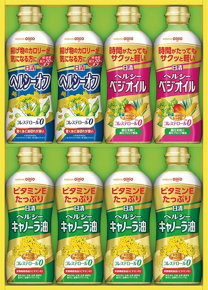 揚げ物のカロリーが気になる方に驚くほど油切れがよい「ヘルシーオフ油」と、活性炭フィルターでろ過し、ビタミンEを添加した「ヘルシーキャノーラ油」(栄養機能食品)に、時間がたってもサクッと軽い「ヘルシーベジオイル」をアソートした詰合です。