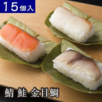 【名称】贈答用木箱入り 柿の葉寿司(さば・さけ・金目鯛)15個入り