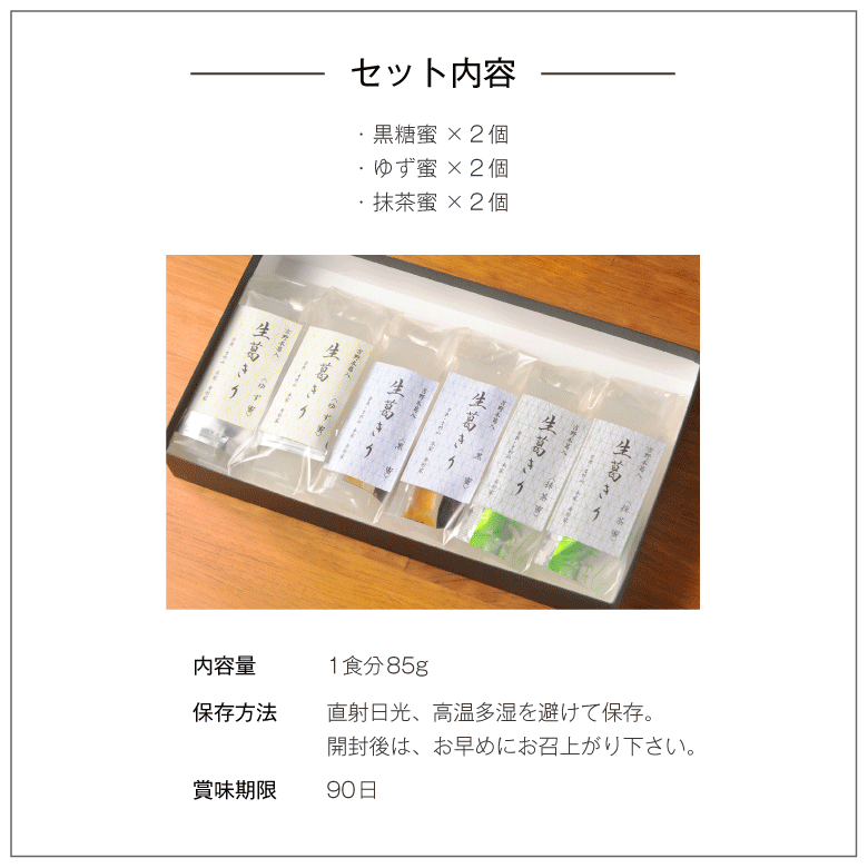 <内容量>85g×6本(黒蜜×2、ゆず蜜×2、抹茶蜜×2)