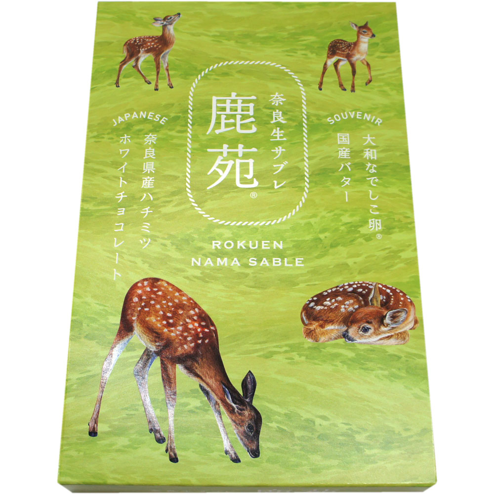 しっとり柔らかな生サブレしっとり柔らかな生地の中に濃厚なホワイトチョコレートがたっぷり入った生サブレ。こだわりの奈良県産の原材料を厳選しております。・古都麦・やまとなでしこ卵・奈良県産蜂蜜表面に押している焼き印は創業当時おせんべいに使っていた焼き印を50年越しに復活させて使用しました。パッケージも何処か懐かしく、でも鹿さんが生き生きと描かれていて、とても素敵です。濃厚でとろけるような生サブレをお楽しみください。【内容量】6枚 【原材料】小麦粉(国内製造)、砂糖、卵、バター、マーガリン、蜂蜜、乳製品、ココアバター、植物油脂、クリーム(乳成分)、麦芽糖、重曹、食塩、洋酒/乳化剤(大豆由来)、セルロース、香料、(一部に小麦・卵・乳成分・大豆を含む)【パッケージサイズ】 約21.5×13.8×2.5cm