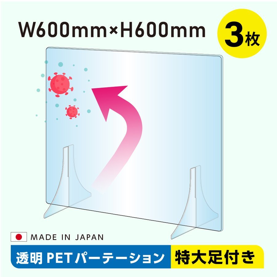 [][3枚セット] [日本製] 透明 PET パーテーション W600×H600mm 特大足付き アクリル板に比べ4〜5倍の強度があるPET樹脂製 fpet-6060-3set
