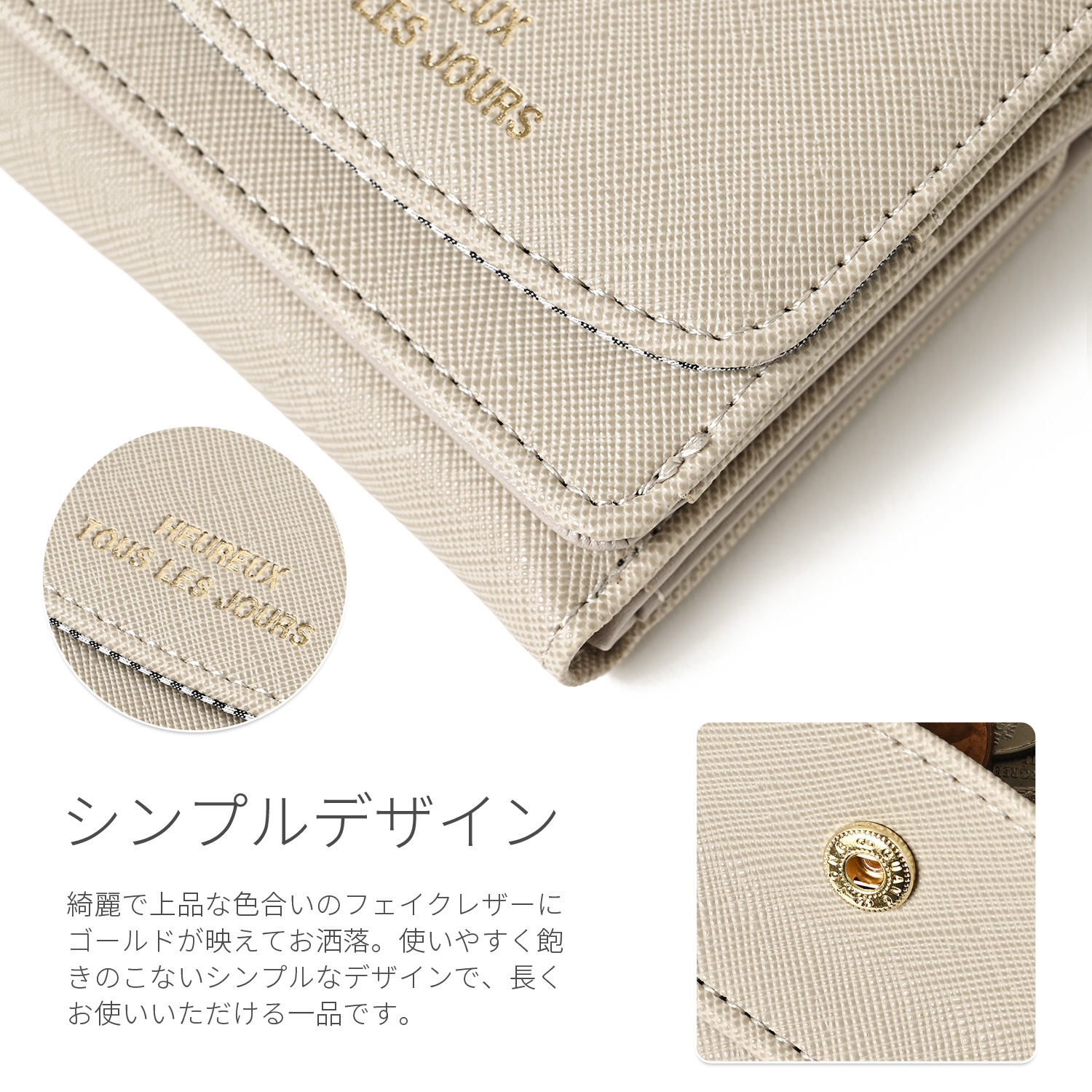 綺麗で上品な色合いのシンセティックレザーにゴールドが映えてお洒落。