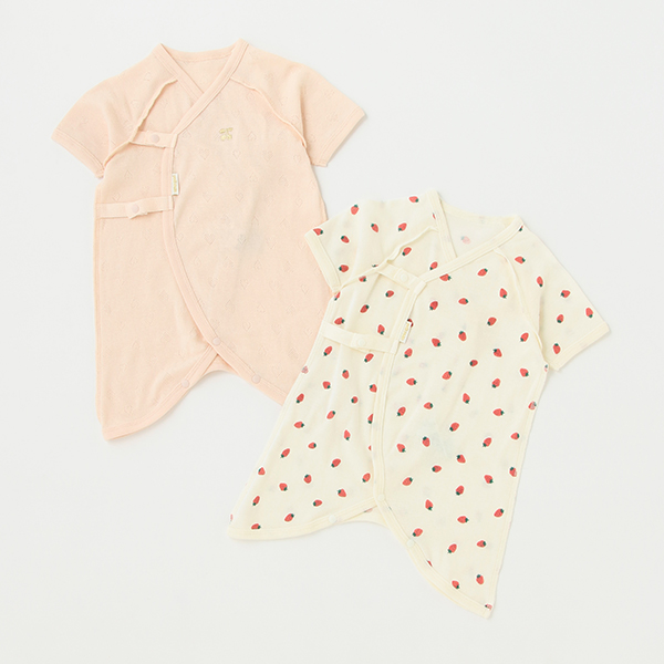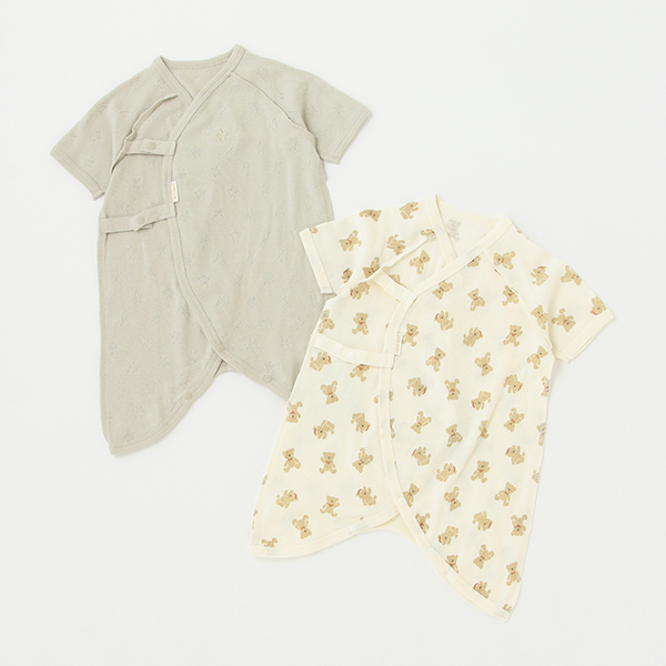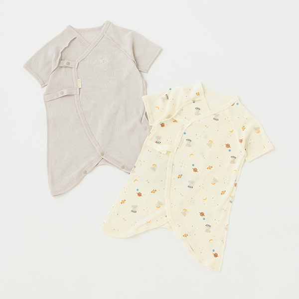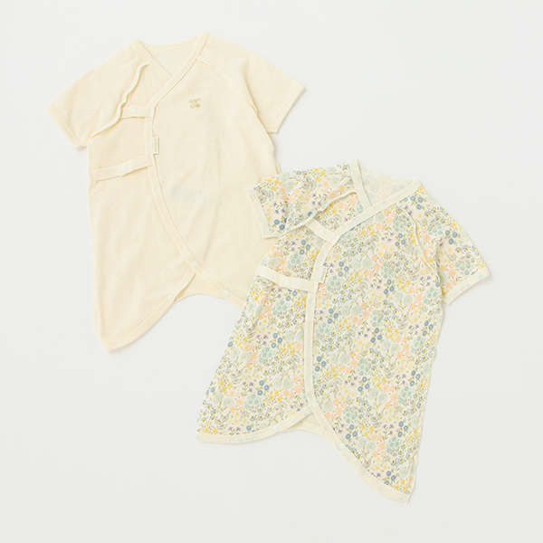 ■産まれてすぐの赤ちゃんに必須のコンビ肌着です。<br><br>脚がM字になる赤ちゃんの体型に合わせた形状で、縫い目やタグを外側にする事でチクチク感を軽減し着やすさを重視した構造。<br>股部分はかけ違い防止に配色ボタンを備えました。<br><br>フロントのスナップボタンと紐結びの2重構造もポイント。<br>さりげない編地が可愛いデザインと総柄の2枚セットなので、洗い替えにも便利なアイテムです。<br><br>お名前を記入できるタグつき。<br>オーガニックコットンを使用しています。<br><br>【おすすめの着用時期は秋冬シーズン】<br><br>【透け感】透けない<br>【生地の厚さ】普通<br>【伸縮性】あり<br>【裏地】なし<br>【ポケット】なし