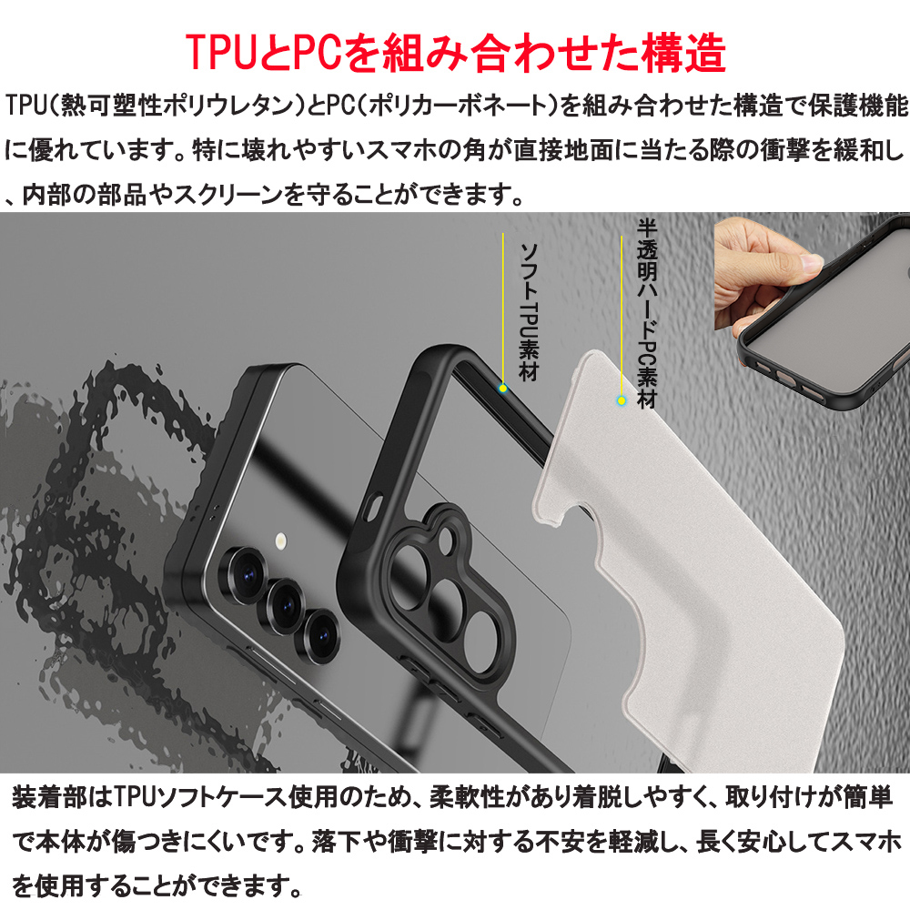 TPUとPCを組み合わせた構造で保護機能に優れています。落下や衝撃に対する不安を軽減し、長く安心してスマホを使用することができます。
